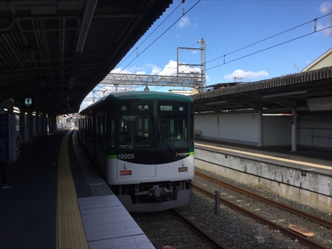 ホームに下りたらちょうど来たので乗り込む。朝方乗ったように京阪への直通運転を行っているし、駅の構造も向かいのホームでの乗り換えになっているが、ICカードで入り直すために2フロア分上り下りの改札往復をした。