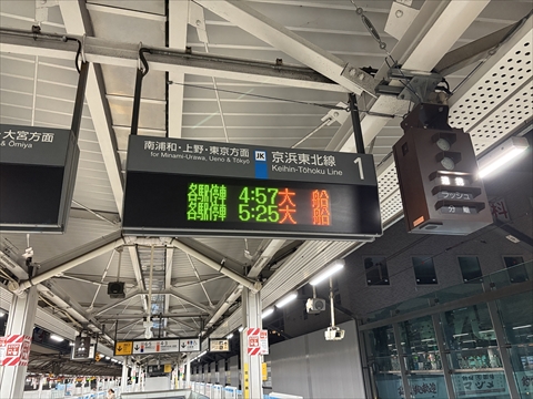 浦和4:57(京浜東北線/大船行)→5:00南浦和5:10(武蔵野線/府中本町行)→5:38西国分寺5:42(中央線快速)→6:11高尾