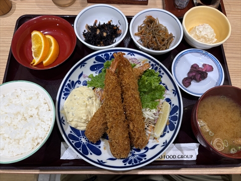 急いでお昼。駅ビルさんすて南館1階「さち福やCAFÉ」で海老フライ定食(1,590円)。何か久しぶりのちゃんとした飯。