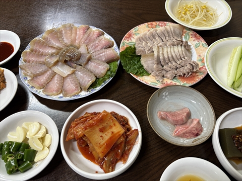 さて木浦ではエイ、ホンオフェ/홍어회を食べてみたい。ネット検索の上、一応フロントで聞いてみたら同じ店舗だったのでそこへ。冗談含みで指を鼻に突っ込むポーズをされて大笑い。