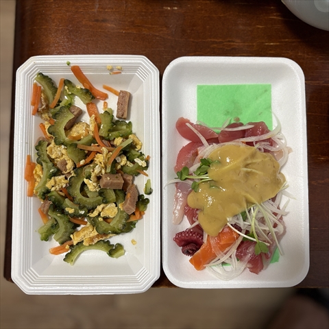 このままいくと食べ無さそうなのでゴーヤーチャンプルーと津波鮮魚店の酢味噌あえ。