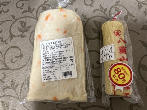 練り物2選。左はちきあぎ。とりあえずはわさび醤油で。右の丸長はそば用。写真ないが後日「宮古風かまぼこ」も購入した。