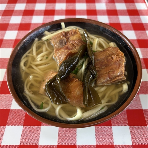 ただし、朝そばを食べると昼の外食の選択肢からは外れやすくなってしまう。ところがそば屋さんは昼の営業が主であったりするから、気合を入れてまず「幸ちゃんそば」へ。待機が数人見えたので「宮里そば」へ転進。ソーキそば(800円)。最新鋭の食券自動販売機でちょっとびっくり。
