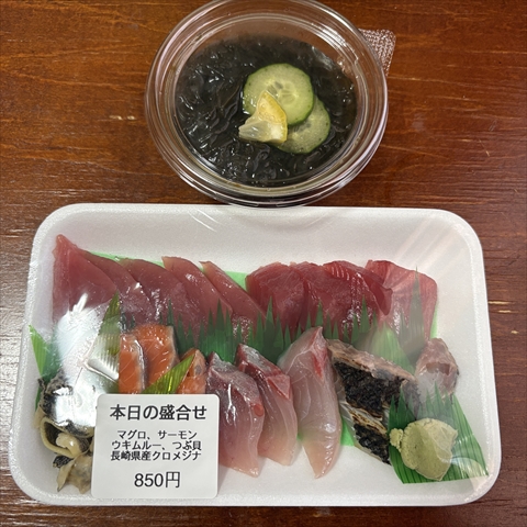 今日も津波鮮魚店へ行き、もずく(250円)と刺身盛り合わせ。